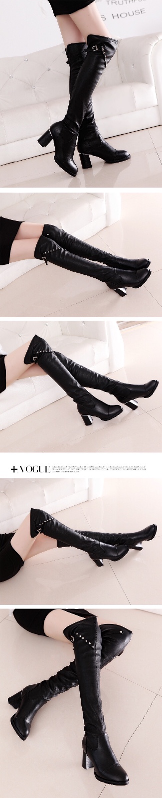 冬季新款欧美风女靴尖头粗跟高跟过膝女长筒靴加绒保暖骑士靴