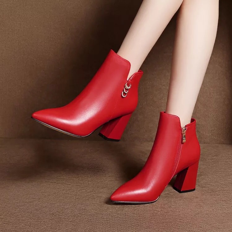 真牛漆皮尖头粗高跟金属装饰女短靴欧美红色鞋摔纹时尚